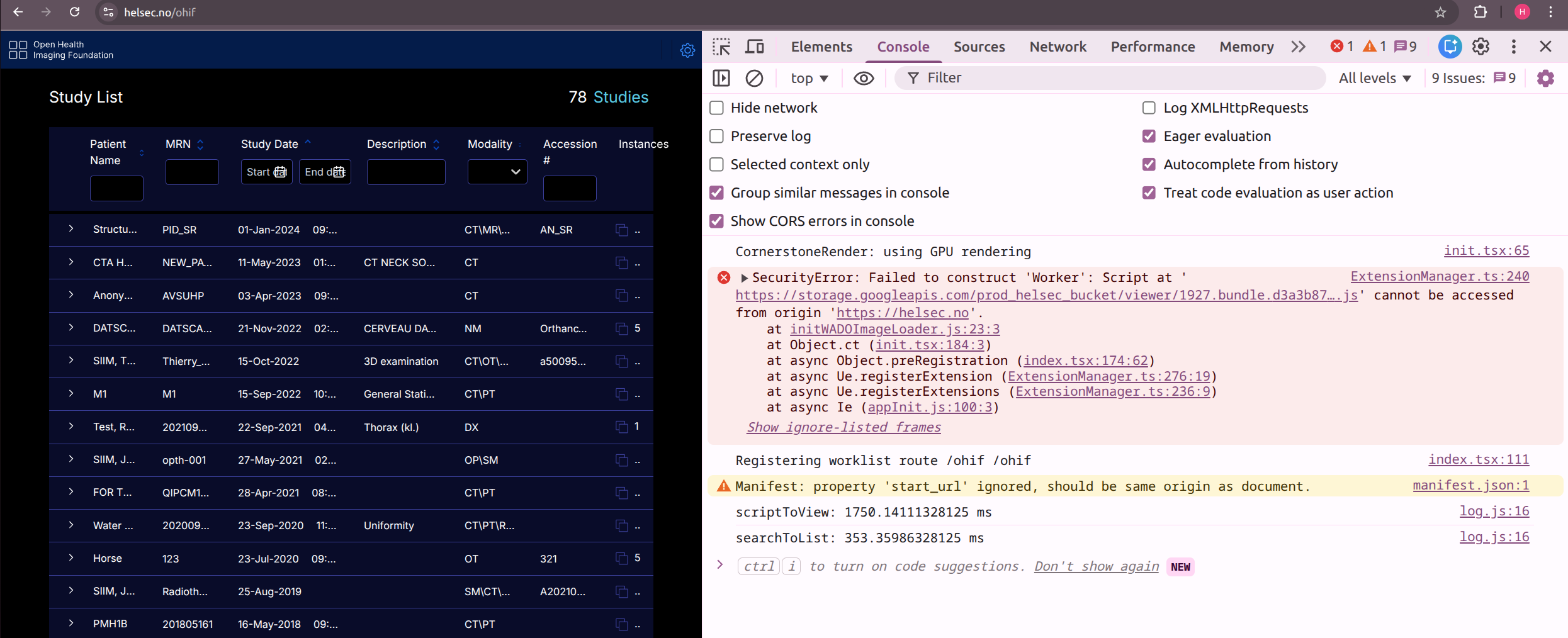 Note that the static OHIF files are served from /static/viewer when running a local django server (that is, the same domain as OHIF index.html). In production however, the OHIF static files are in a Google storage bucket at /prod_helsec_bucket/viewer/ - so a different domain that the OHIF index.html. Can this cause the issue?